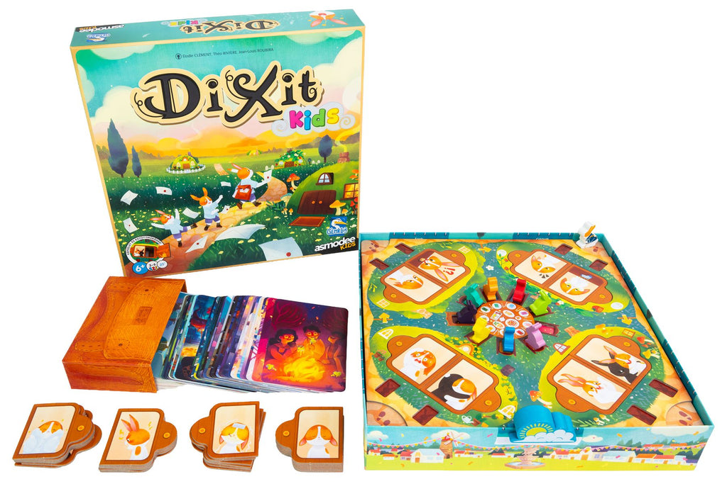 In the cooperative children's game Dixit Kids, you work together to invite as many guests as possible to the Swift Rabbit's big birthday party! In each round, one of you takes on the role of the Swift Rabbit. They visit a rabbit burrow and choose one of the rabbits to be their birthday guest. The Swift Rabbit then selects a card from their hand that matches the guest's mood: this card is the invitation.