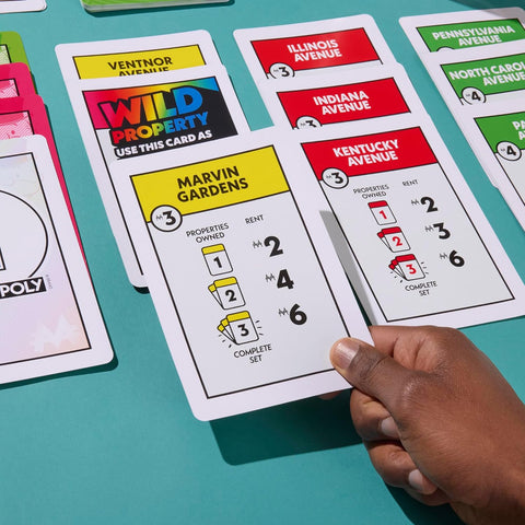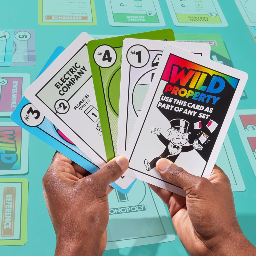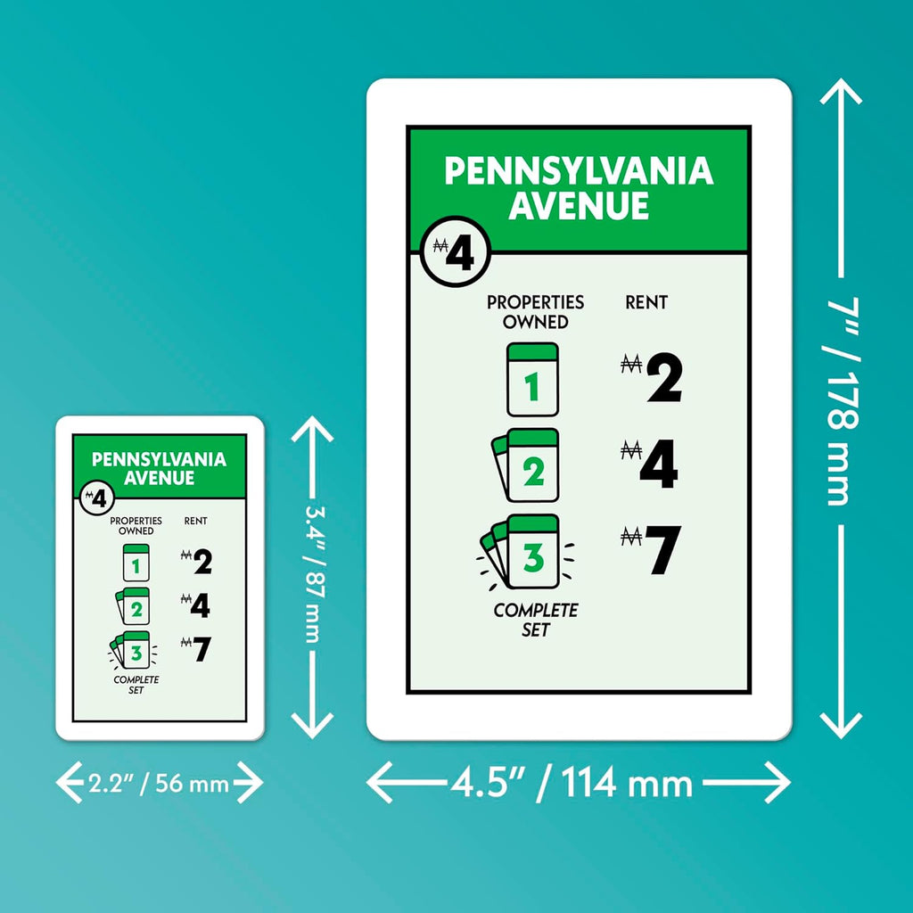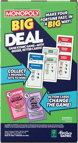 Monopoly Big Deal is a jumbo-sized version of the popular, fast-paced 15-minute card game, featuring cards four times larger than the original Monopoly Deal. Designed for 2–5 players (ages 8+), the objective is to be the first to collect three full property sets of different colors by stealing, renting, and swapping cards.