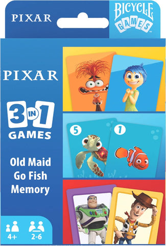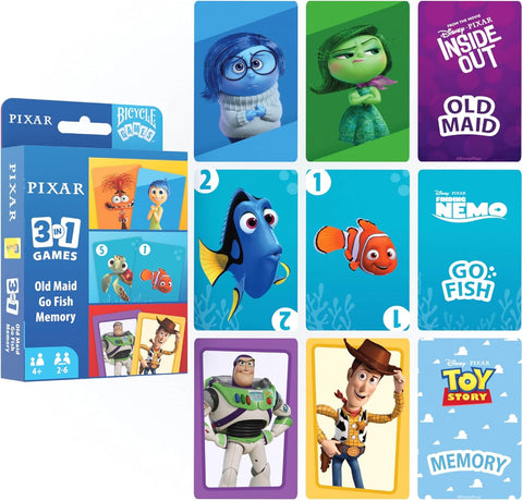DISNEY & PIXAR MAGIC: Play three classic kids card games with beloved characters from Toy Story, Finding Nemo, and Inside Out. 3 FUN GAMES IN 1 SET: Includes 3 timeless card games Old Maid, Go Fish, and Memory reimagined in 1 set featuring colorful Disney and Pixar artwork. LEARNING THROUGH PLAY: Designed for ages 4+, this set helps preschoolers build matching, memory, and early strategy skills while keeping play fun.