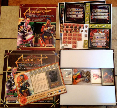 Argent: Mancers of the University is an expansion to Argent: The Consortium featuring a new candidate, new rooms, and a bunch of new spells, treasures, apprentices, and supporters. Technomancy is the school of magic that deals with observable, repeatable phenomenon. Technomancers themselves don't use magic, but they build devices that contain, process, and manipulate the natural magical energy of the world. The Department of Technomancy encompasses three schools: Alchemy - Mystical biology and medicine, the creation of homunculi, and the transmutation of base elements. Mechanics - The creation of fantastic machines that defy the laws of physics by magical means. Artifice - The binding of enchantments to magical gear, creating items that have powerful mystical properties.