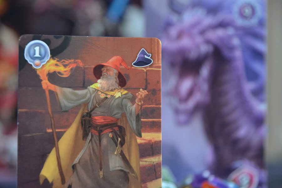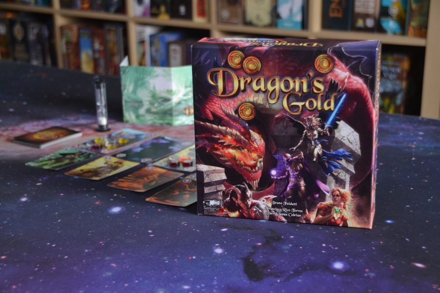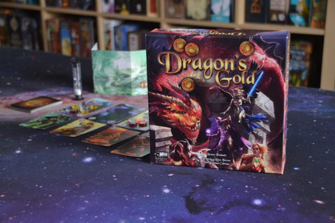 In Dragon's Gold, each player controls a team of dragon hunters (two knights, a thief, and a wizard). Like all dragon hunters, they have only one goal: gold, silver, jewels and magic objects. As for actually killing a dragon? It's a piece of cake. But the most difficult part comes after the dragon is dead: the adventuring party has to figure out how to share the spoils. As soon as a dragon is overpowered, then some additional gems are revealed, and the players who had participated in that hunting party start a negotiation over how to divvy up the gems. If the sixty-second sand timer runs out, then no one gets treasure. When all of the dragons have been slain and the treasure claimed or discarded, the game ends and players score for their holdings, with silver and magic objects worth 1 point each, gold worth 3, the Black Diamond worth 7, and the colored gems scoring 10-15 points for those players who hold more than everyone else. (In the Advanced game, the colored gems score 8-12 points in addition to a variety bonus of 5 points for each set of different colored gems a player holds. The Black Diamond is worth 19 points [in the 2011 edition], but negates a player's score for all colored gems.)