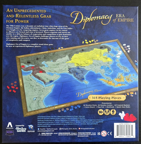 The 19th Century was a dynamic, yet turbulent time when huge areas of the Ottoman Empire, the Indian sub-continent, China, Indochina, and the East Indies were fought over by competing empires. In Diplomacy: Era of Empire, seven great empires — Britain, France, Russia, Turkey, China, Japan, and the Netherlands — vie for control as alliances are formed and trust is betrayed. Players negotiate and outwit one another in a delicate balance of co-operation and competition to gain dominance of the region. Players must rely on their own cunning and cleverness, not dice, to determine the outcome of this game of conspiracies and conquest. Diplomacy: Era of Empire is a standalone game for new or experienced Diplomacy players that's based on 1994's Colonial Diplomacy, but with an updated map for balance purposes, the removal of certain mechanisms that required three pages of errata, and other rule tweaks.