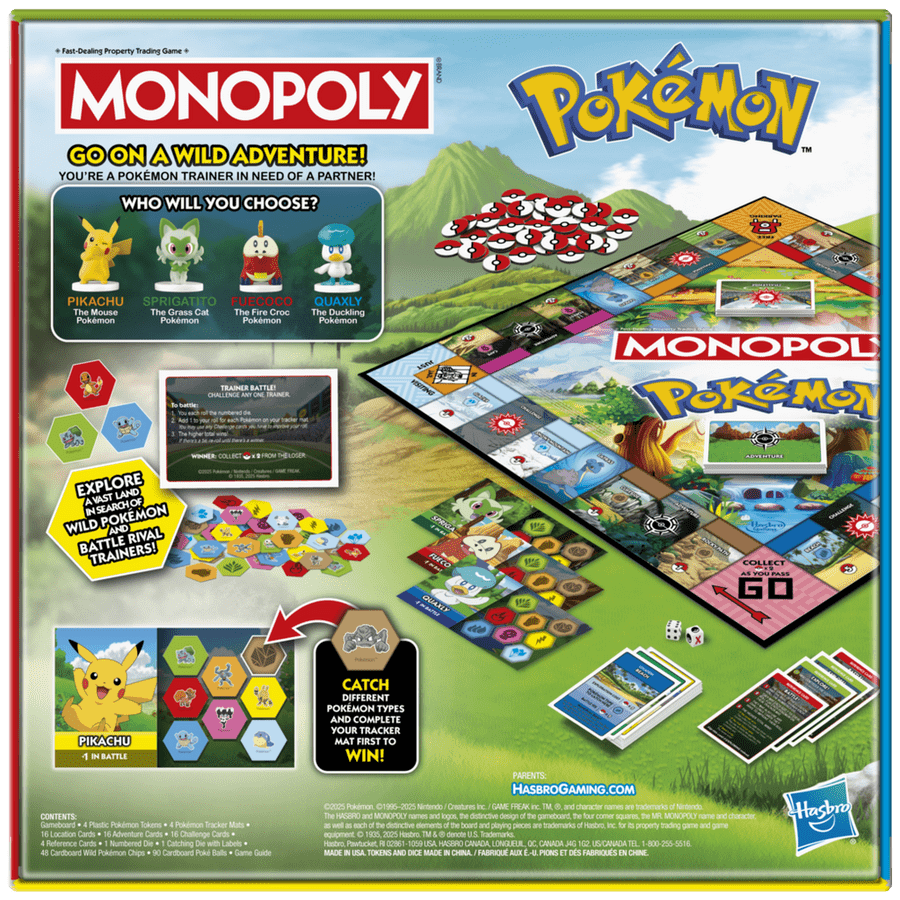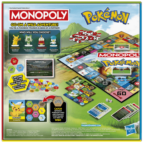 Race to catch the wild Pokémon! The Monopoly Pokémon Edition game combines classic Monopoly gameplay with thrilling Pokémon-catching action. Play as a Pokémon Trainer adventuring through a vast land with a Pokémon partner. In this fun kids game, Properties are vibrant locations and Poké Balls replace money. Players explore locations, catch different types of wild Pokémon to add to their tracker mat, and battle rival Trainers to collect Poké balls. Be the first Trainer to complete their tracker mat or the last Trainer with Poké balls to win! This Pokémon game is an engaging kids board game for Family Game Night, and it makes a great Pokémon gift for boys, girls, and kids ages 8 and up who are Pokémon fans and Monopoly board game fans.
