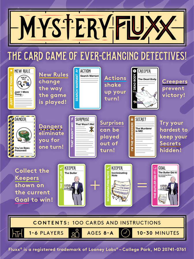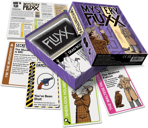 Fluxx is a card game in which the cards themselves determine the current rules of the game. By playing cards, you change numerous aspects of the game: how to draw cards, how to play cards, and even how to win. At the start of the game, each player holds three cards and on a turn a player draws one card, then plays one card. By playing cards, you can put new rules into play that change numerous aspects of the game: how many cards to draw or play, how many cards you can hold in hand or keep on the table in front of you, and (most importantly) how to win the game. In Mystery Fluxx, a slew of detectives is trying to solve the mystery by collecting clues, examining locations, finding weapons, and sussing out secrets...all without being eliminated themselves!