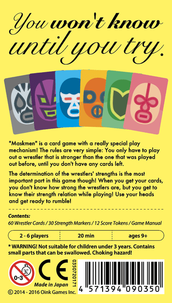 Welcome to the world of Pro Wrestling! You must win at any cost or face the wrath of your sponsors. This year there are six new wrestlers debuting, so go out and win some matches! Over the four seasons of maskmen, whoever has won the most points is the winner. In a round, players can play cards or pass on their turn. Players play 1-3 cards on their turn of the same type of wrestler (that hasn't already been played), to help resolve the strength of the wrestler. The faster you get rid of your cards, the better your chances of winning. As soon as you rid your cards you get to take the highest point token available, then the next player to go out gets the next token. Once there is only one player remaining, the round ends and that player gets the -1 token.