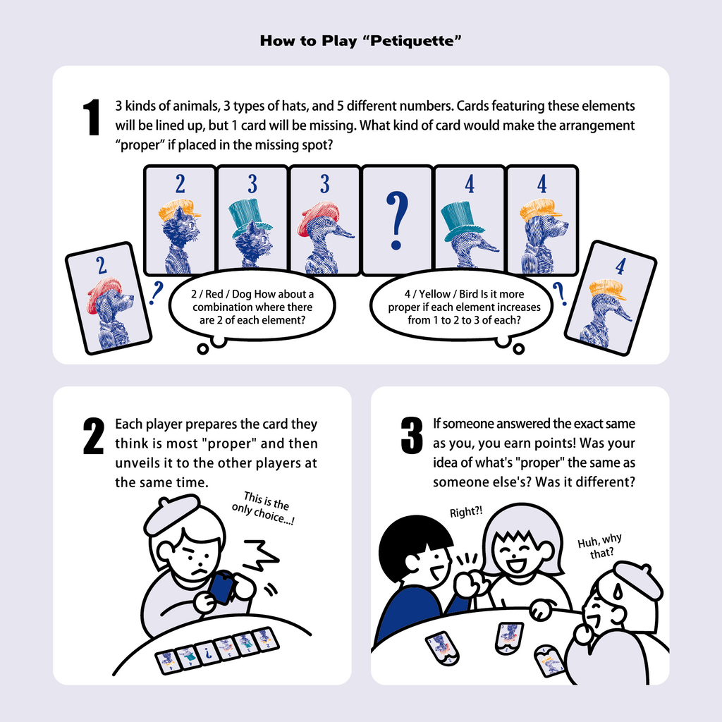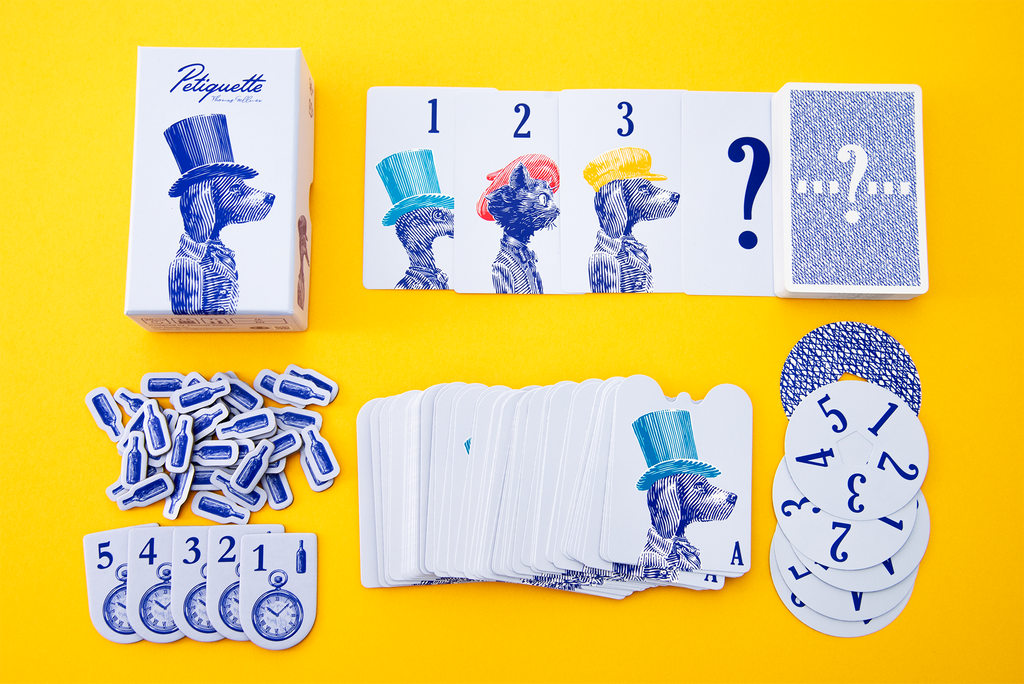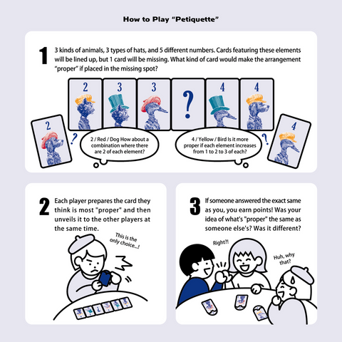 Humans are curious creatures. Even when cards are randomly lined up, we can't help but find patterns...and ideally we're thinking along the same lines. Each round in Petiquette, players look at a line-up of five random cards — with cards showing one of three animals that is wearing one of three hats, with a number from 1-5 at top — and try to find some logic or pattern within them. Each player secretly chooses the card they think would most properly fit into that pattern. For example, if the sequence is "red, red, yellow...", you might feel that yellow should come next. If it's "dog, cat, bird...", then maybe dog feels right...but what about "dog, cat, dog, cat, bird"? No single answer is correct, but if someone chooses the same card as you, you both earn points. Petiquette can be played either competitively or co-operatively.