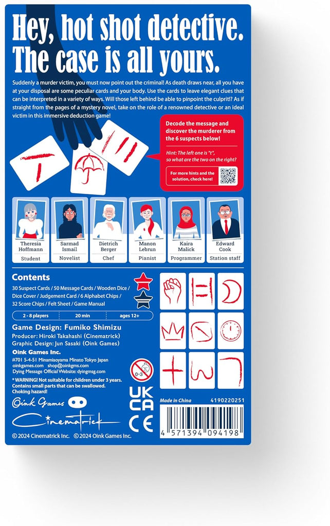 你被謀殺了!嗯,還沒完全死,你還有機會傳達兇手的身份,但你能使用的工具非常有限:幾張帶有模糊記號的卡片,以及……你自己。沒錯,是你垂死的身體。或許你可以透過排列卡片來傳遞訊息,或是用尚能活動的手指指向——或遮住——卡片的某些部分,以強化你最後的思緒。如果線索太容易理解,兇手會將其摧毀;如果太難理解,則無人能解讀,你的死亡將無法被復仇。所以,請留下一則精妙的臨終訊息。其他玩家在《Dying Message》中扮演偵探,根據有限的資訊進行推理。偵探們可以合作或互相對抗,而推理的成敗則取決於他們的討論。