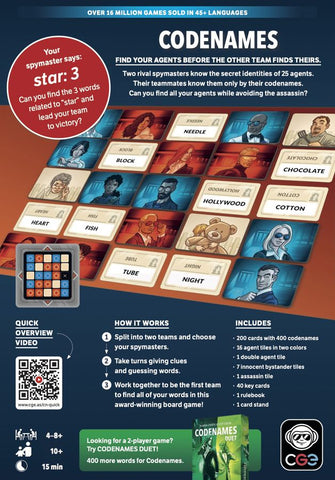 兩位敵對的情報頭目知道 25 名特工的秘密身份。他們的隊友只知道特工的代號——像「疾病」、「德國」和「胡蘿蔔」這樣的單字。每位情報頭目都希望自己的隊伍能率先辨認出所有特工……同時避免誤揭刺客。在《Codenames》中,兩隊競爭,看誰能先與所有特工接觸。將 25 張卡牌鋪開,每張卡牌上都有一個單字。情報頭目查看顯示每張卡牌身份的卡片,然後輪流給隊友提示。提示由一個單字和一個數字組成,數字表示場上有多少張卡牌與該提示字有關。隊友接著指出他們認為屬於自己隊伍的一名特工;若正確,他們可以繼續猜測,最多比提示數字多一次;若該特工屬於對方隊伍或是無辜路人,該隊回合結束;若選到刺客,則直接輸掉遊戲。情報頭目持續給出提示,直到某隊辨認出所有特工,或某隊因刺客而被淘汰。