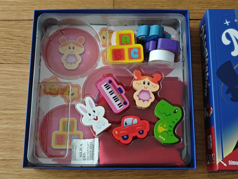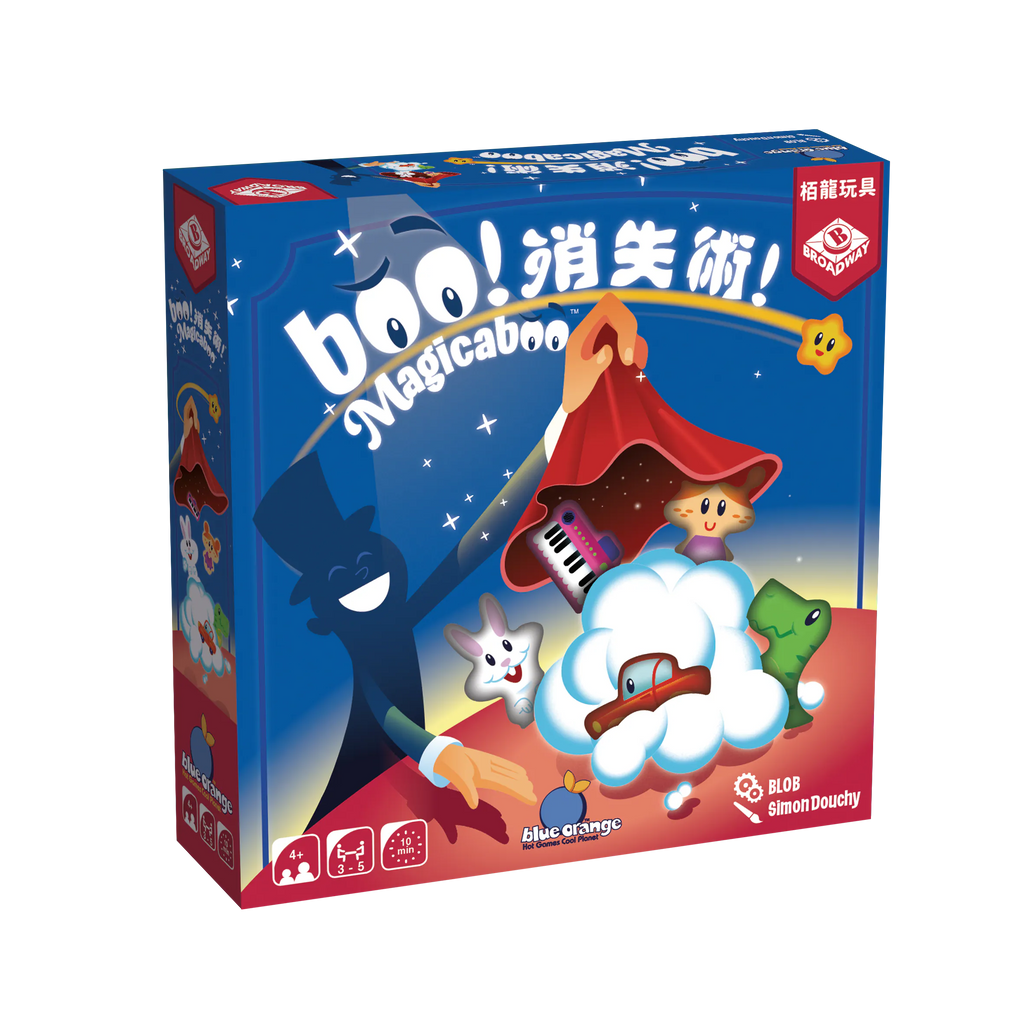 你能看出在 Magicaboo 中消失的是什麼嗎?每回合,一位玩家扮演魔術師,將一塊大布蓋在遊戲區中央的所有木製物件上,然後在布下拿走其中一件並移開。Magicaboo!其他玩家需要搶先辨認出哪一件物品消失,若答對即可獲得一顆星。建議使用進階玩法。