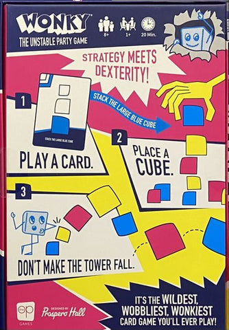 在 Wonky 中,玩家需要透過堆疊方塊來出掉手上的卡牌,並嘗試設計出讓其他玩家失敗的局面,讓他們反而要抽更多卡。遊戲的關鍵在於特製的方塊:共有九個方塊,分為大小中三種尺寸,每個方塊有三面是平面,三面是弧面。只要巧妙地堆疊,就能阻擋對手的勝利之路。